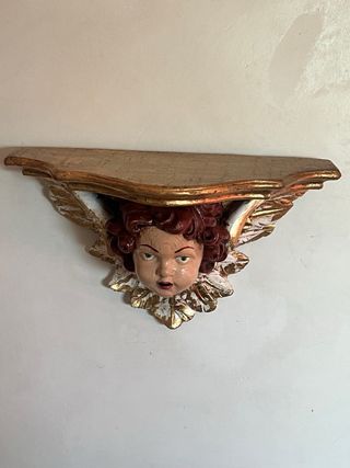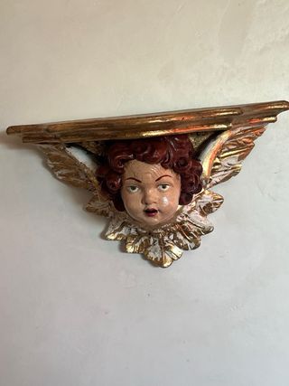 Preciosa ménsula decorativa con diseño de ángel. - Fabricada en resina. - Acabado principal en dorado y multicolor. -pintada a mano