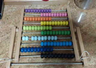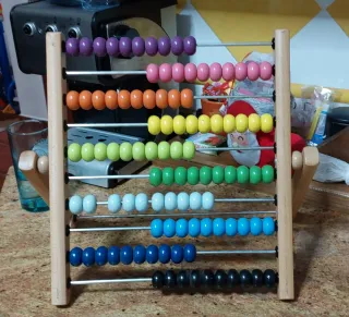 Clásico ábaco de madera con varillas metálicas y cuentas de colores. - Estructura de madera. - Cuentas de madera en varios colores: morado, rosa, naranja, amarillo, verde claro, verde oscuro, azul claro, azul, y negro.