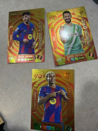 Lote de tres cromos de fútbol de la colección Panini Oro Premium. - Cromo de Pedri (FC Barcelona). - Cromo de Isco (Real Betis). - Cromo de Ansu Fati (FC Barcelona).