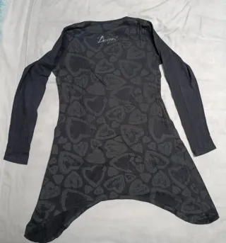 Vestido corto asimétrico con estampado de corazones en toda la prenda. Presenta un diseño único y llamativo. - Manga larga. - Estampado de corazones en tonos oscuros. - Detalle de corazón rojo con diseño floral en la parte delantera. - Mide 47 cm de axila a axila y 74 cm de largo. - Sin defectos.