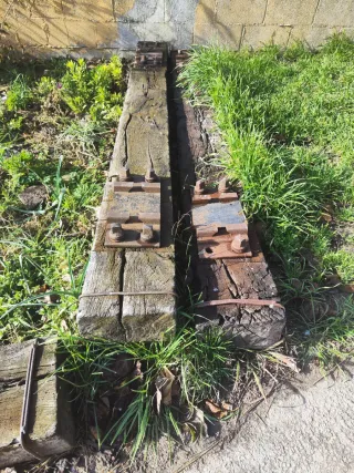 Ocho vigas de madera antiguas, procedentes de vías de tren. Ideales para proyectos de decoración rústica o construcción. Se venden por 50€ cada uno o 300€ las ocho juntas. - Material: Madera. - Uso previo: Vías de tren. #bigastren# #bigasgruesas# #bigamadera#