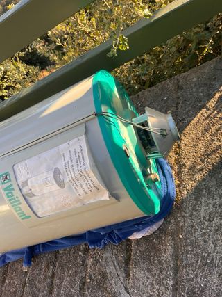 Caldera a gas con acumulador de agua. - Marca Vaillant. - Color gris y verde.