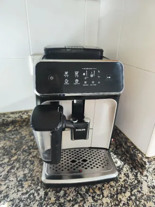 Cafetera automática Philips Serie 2200 en color negro y plateado. Perfecta para preparar tus cafés favoritos en casa. - Panel de control táctil con iconos. - Dispensador de café ajustable. - Depósito de agua extraíble. - Bandeja de goteo extraíble.