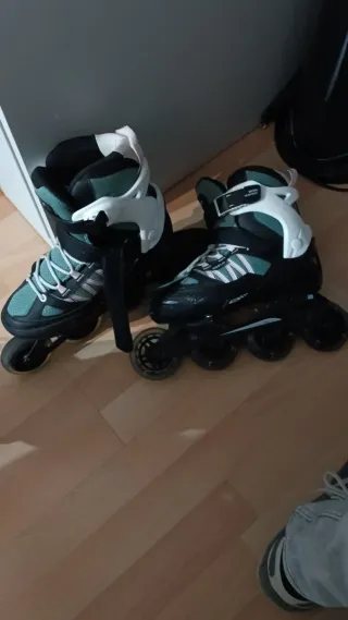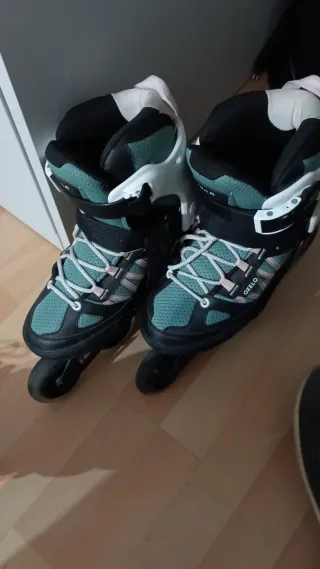 Patines en línea Oxelo en color verde y negro. Perfectos para iniciarse en el patinaje. - Cierre con cordones, velcro y hebilla. - Ruedas de 76mm. - Rodamientos ABEC 5. - Talla ajustable 38-40.