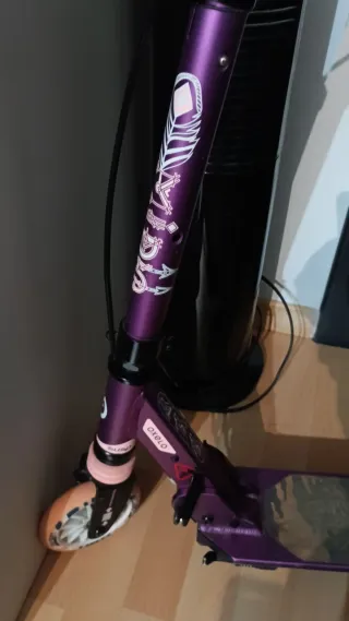 Patinete de la marca Oxelo en color morado. - Diseño con pegatinas de plumas y motivos geométricos. - Ruedas de color naranja. - Base con diseño de camuflaje.