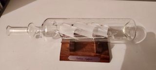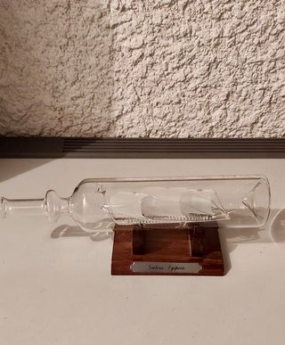 Detalle de barco de cristal con forma de galera egipcia, presentado dentro de una botella de vidrio. Dimensiones: 24cm de ancho x 7cm de fondo x 8cm de alto - Barco de cristal. - Botella de vidrio. - Base de madera con placa Galera Egipcia.