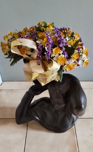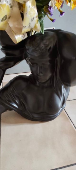 Original jarrón con forma de escultura de hombre en color negro. Presenta un diseño moderno y llamativo, ideal para dar un toque distintivo a tu hogar. - Material de escayola. - Acabado en negro. - Las medidas son sin las flores