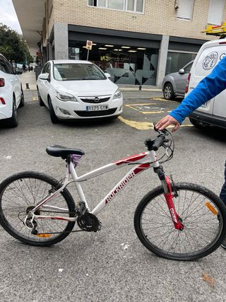 Bicicleta de montaña Rockrider con un diseño llamativo en blanco y detalles rojos. - Cuadro de aluminio. - Ruedas de 26 pulgadas. - Frenos de disco. - Cambio Shimano.