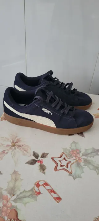 Zapatillas deportivas Puma de ante azul con detalles blancos y suela de goma marrón. - Cierre de cordones. - Logo de Puma en el lateral y la lengüeta. - Suela de goma antideslizante.