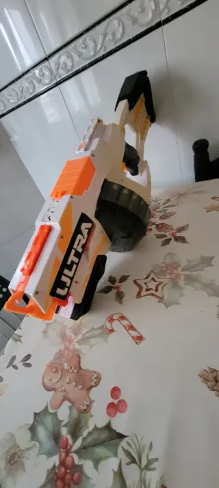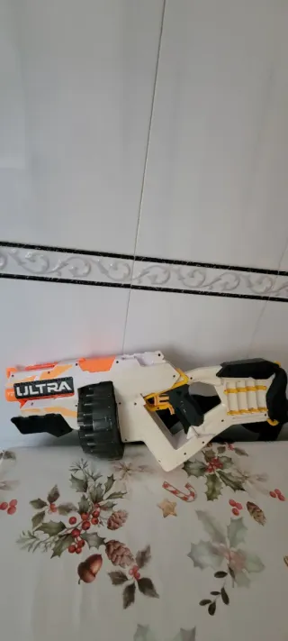 Pistola de juguete Nerf Ultra, ideal para juegos. - Diseño en blanco y naranja. - Tambor giratorio. - Marca: Nerf.