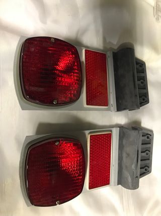 Conjunto de pilotos para remolque, incluyendo luz de matrícula. - Dos unidades de pilotos circulares negros con cables rojos. - Una unidad de piloto/lente de repuesto en color rojo y ámbar.