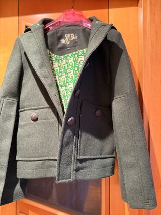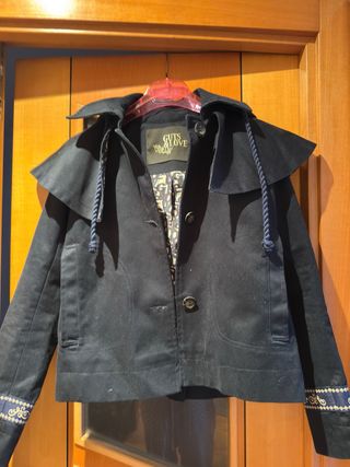 Gabardina corta de la marca GUTS&LOVE, usada una sola vez. - Diseño moderno y elegante. - Detalle de cordones en la capucha. - Acabado de alta calidad.