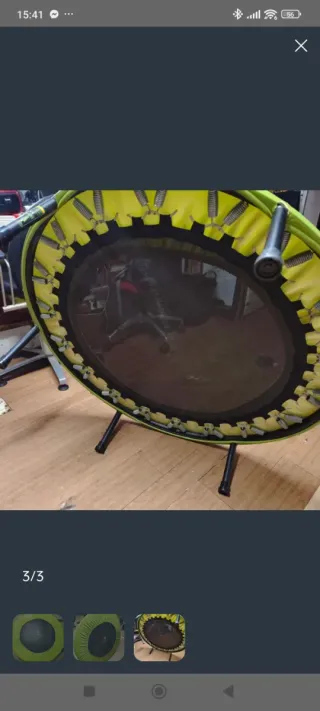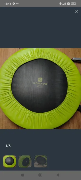 Mini trampolín de fitness de la marca Domyos, ideal para ejercicios cardiovasculares y tonificación. - Color verde lima. - Superficie de salto negra. - Estructura plegable para fácil almacenamiento.