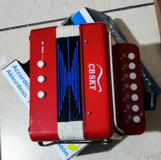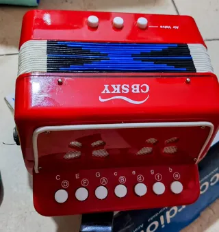 Acordeón infantil de la marca CBSKY en color rojo. Ideal para iniciarse en la música. Hecho de resina ABS de grado alimenticio, no tóxica e inofensiva, los niños aprenden y juegan 100 % seguro. El fuelle está hecho de cuero, papel kraft y tela, es resistente y duradero y puede protegerse de daños. - Contribuye a la creatividad, la concentración y la inteligencia de los niños, y también desarrolla el talento musical, la coordinación mano-ojo y el sentido del ritmo de los niños. - Lados equipados con una hebilla de cinturón que facilita la sujeción. En muy buen estado. La caja es lo único q está algo deteriorada.