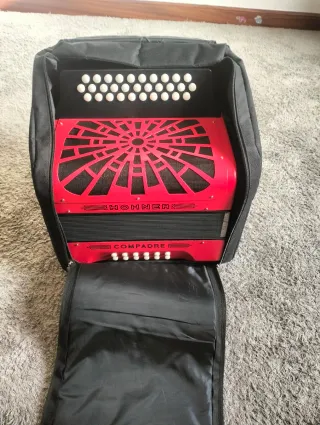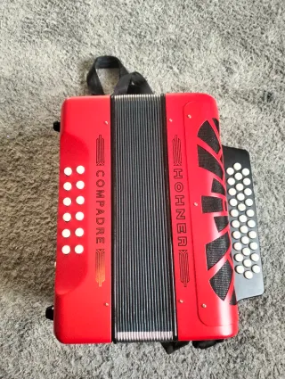 Acordeón de botones Hohner Compadre en color rojo. - Diseño clásico. - Teclado de botones. - Acabado brillante. - Afinación sol-do-fa. - Perfecto para tocar música norteña, cómodo y con un sonido característico. -Peacticamente no se ha usado. Está en muy buen estado.