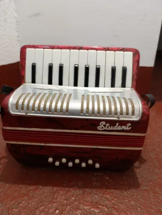 Acordeón de color rojo con diseño clásico. - Teclado blanco y negro. - Rejilla plateada. - Detalle de la marca Student en plateado. Medidas: Ancho 25 centímetros, Fondo 15 centímetros y Alto 22 centímetros.