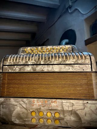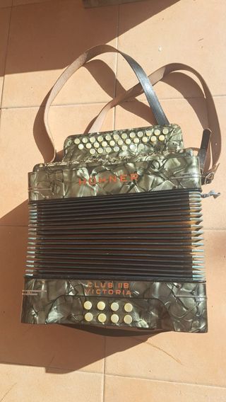 Hohner Club IIB Victoria en acabado verde nacarado. Un clásico alemán muy buscado por su sonido y estética. • Modelo: Victoria (botones de nácar). • Estado: Muy buen estado estético. • Incluye: Maleta rígida original para transporte. • Uso: Ideal para música tradicional, folk o coleccionismo. Se puede ver y probar sin compromiso.