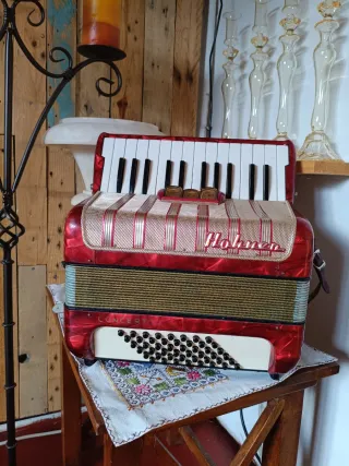 Acordeón Hohner de color rojo, fabricado en 1960. Un instrumento clásico con un diseño distintivo. - Acordeón Hohner. - Color rojo. - Año de fabricación: 1960.