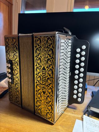 Acordeón Hohner con un diseño clásico en negro y detalles dorados. Presenta un teclado blanco y negro y botones en la parte inferior. Envío NO disponible, sólo venta en persona.