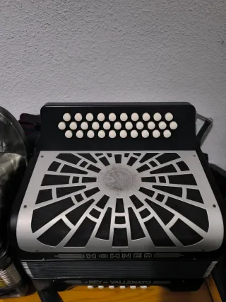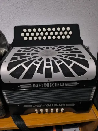 Acordeón Hohner modelo Rey Vallenato con 5 letras. - Diseño clásico en color negro. - Detalles plateados en la tapa. - Teclado blanco. - Rejilla frontal con patrón geométrico.