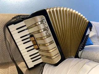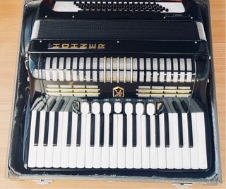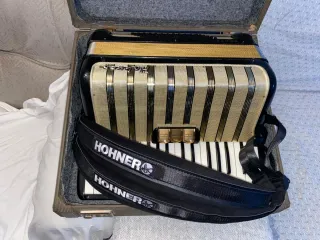 Acordeón Hohner original, modelo de piano con 40 bajos. Es un acordeón clásico, compacto y fácil de manejar, ideal para principiantes o para quien busca un instrumento ligero y práctico. El acordeón está en buenas condiciones, con teclas, botones y fuelle funcionando correctamente. Va junto a su maleta.