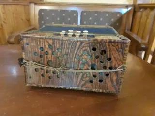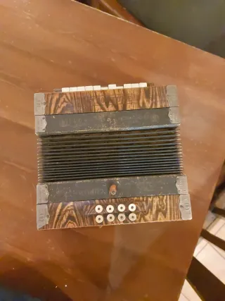 Acordeón Hohner antiguo, ideal para coleccionistas. Presenta un diseño clásico con acabados en madera y detalles metálicos. - Teclas blancas en la parte superior. - Botones redondos en la parte inferior. - Bellows (fuelle) de acordeón.