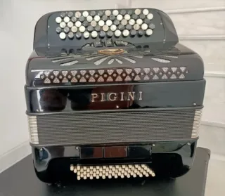 Acordeón Pigini Convertor 62 bajos 3 registros en la tecla y 3 registros en los bajos Es convertor, puede cambiar entre bajos standar y bajos libres Nuevo costó más de 3000€ Muy buen estado, afinado y con correas nuevas a estrenar de gran calidad Se envía en funda acolchada Hohner nueva. Hago envíos y acepto pagos por Wallapop - Color negro brillante. - Diseño elegante con detalles plateados. - Teclado en el lado derecho con botones blancos.