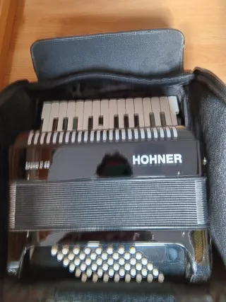 Acordeón cromático Hohner Bravo II 60 con poco uso. Comprado hace escasos meses ( se puede mostrar factura ). Correas y funda marca Hohner incluídas. 26 Teclas en el cantante. 60 Botones en el bajo. 2 Juegos de voces. 2 Registros en el cantante. Funda de alta calidad. Color: Negro. Peso: 5,1 Kgs.