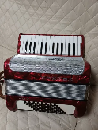 Acordeón Hohner en color burdeos y dorado, con funda incluida. - Teclado blanco y negro. - Correa de sujeción. - Diseño clásico.