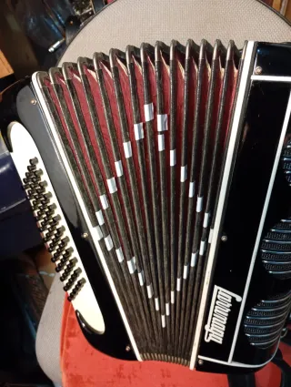 Acordeón Pigini en buen estado. Un instrumento musical clásico y elegante. - Color negro brillante. - Diseño tradicional de acordeón. - Marca Pigini.