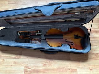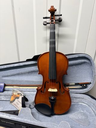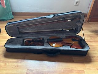 Violín, viene con dos arcos, un paquete de cuerdas de recambio, una almohadilla, un puente de violín, dos afinadores digitales, resina y el estuche. El estuche tiene un golpe y está un poco abollado pero sirve perfectamente y la resina está un poco picada pero todo lo demás está en perfectas condiciones. 🙌