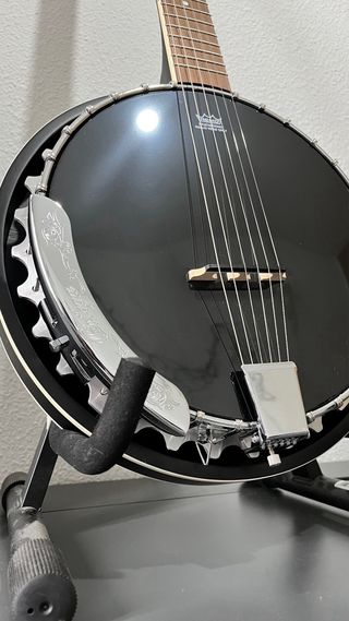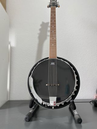 Banjo Ortega de 6 cuerdas en excelente estado, casi sin uso. - Cuerpo negro. - Mástil de madera. - Aro metálico decorado. 3 semanas de uso, lo vendo porque compré un banjo tenor. Ideal si eres principiante y quieres adentrarte en el hermoso mundo del banjo. Afina exactamente como una guitarra. El banjo suena potente y un sonido con excelente resonancia. ¡Último precio! Se puede ver y probar en Madrid (Alcobendas) Se entrega con su estuche original. De realizar la compra con envío, el banjo iría súper protegido.