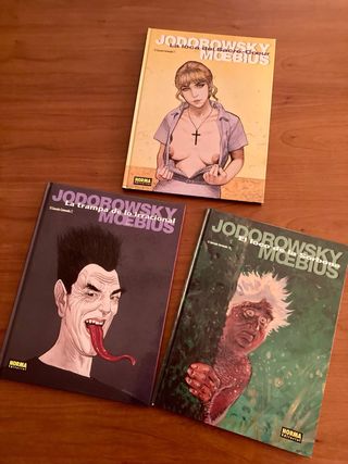 Trilogía El Corazón Coronado, de Jodorowsky y Moebius, publicada originalmente por Norma Editorial en 1993 compuesta por tres álbumes individuales: 01-La Loca del Sacre Coeur. 76 pags. 1993 02-La Trampa de lo Irracional. 68 págs. 1995 03-El Loco de la Sorbona. 56 págs. 2000 Español, tapa dura, color, 32 cm x 24 cm Como nuevos. Descatalogados. NO se venden separados. NO hago envíos por Correos.