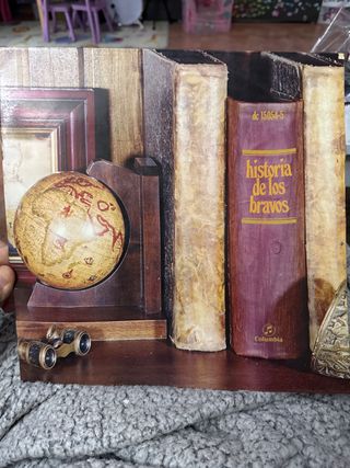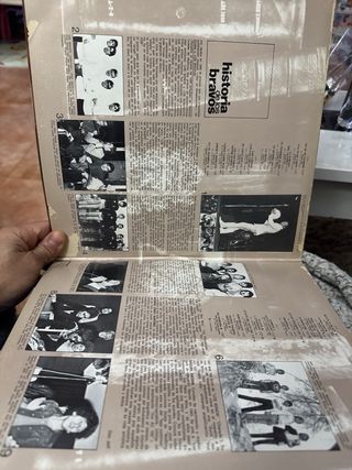 Disco de vinilo con el álbum Historia de los Bravos. - Portada con diseño de libros antiguos y globo terráqueo. - Incluye binoculares y marco de fotos decorativos. - Sello discográfico Columbia.