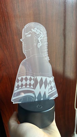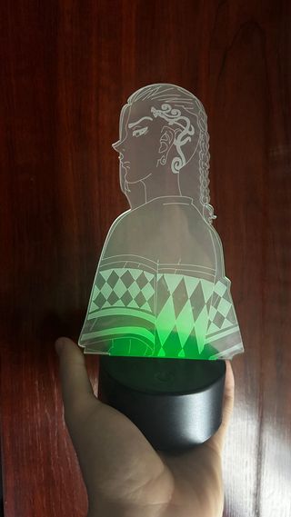 Lámpara decorativa con diseño de personaje de anime. - Base redonda negra con botón de encendido. - Figura acrílica con grabado detallado. - Diseño con motivos de rombos en la vestimenta. - Va a pilas. - Varias combinaciones de colores.