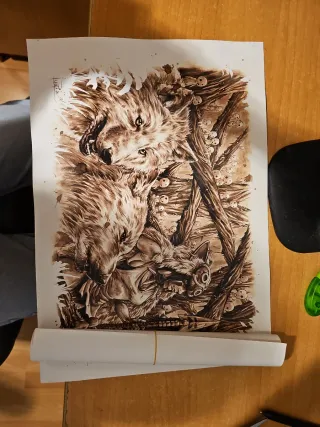Póster artístico de la película Princesa Mononoke, realizado con técnica de café. - Medidas: 46 x 32 cm. - Técnica: Café. - Diseño inspirado en la película. - Ideal para coleccionistas y fans. Más un POSTER SORPRESA dina3 !! En la esquinas está un poco desgastado porque tenía celo
