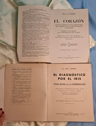 -El Corazón – Dr. A. Vander (1960) - Nueva edición ampliada y puesta al día. - Contiene tratamientos y explicaciones sobre enfermedades del corazón: debilidad cardíaca, ahogos, palpitaciones, presión alta/baja, ataques cardíacos, etc. - Incluye numerosas ilustraciones originales. - Ejemplar ideal para coleccionistas de medicina antigua o curiosos de la historia de la salud. 📖 El diagnóstico por el iris y otros signos de las enfermedades – Dr. Adr. Vander (1941) - Obra clásica sobre iridología y diagnóstico natural. - Con 27 páginas de grabados y 8 láminas en color. - Explica cómo identificar predisposiciones y constit