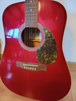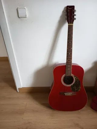 Guitarra acústica de color rojo con muy buena resonancia. - Cuerpo de tamaño completo. - Mástil de madera de nogal. - Clavijero metálico.