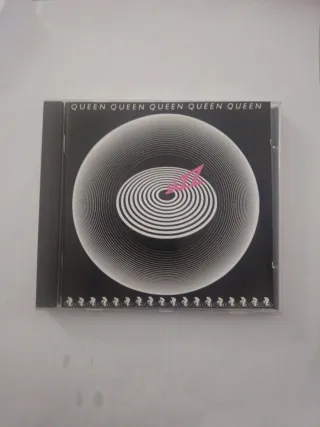 CD del álbum Jazz de Queen. - Portada con diseño circular y el título Jazz en rosa. - Banda de pequeños ciclistas en la parte inferior de la portada.