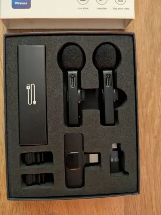 Este es un set de micrófonos inalámbricos con conexión Bluetooth. - Incluye dos micrófonos. - Incluye un receptor. - Incluye cable de carga. - Diseño compacto y portátil. Se vende por no usar