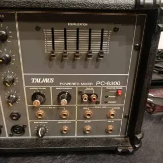 Mezclador amplificado Talmus PC-6300. - Ecualizador gráfico. - Control de volumen maestro. - Control de reverberación maestro. - Entrada de cinta (Tape In). - Alimentación Phantom Power. - Indicadores de Power y Protect. - Conexiones Aux In, Send, Return, Mix Out y Amp In. - Control de nivel de monitor.