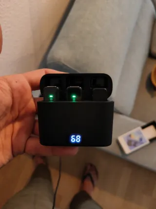 Este set incluye dos micrófonos de solapa inalámbricos y su estuche de carga. - Diseño compacto y elegante. - Indicadores LED de estado. - Estuche de carga negro.