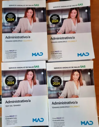 Vendo colección completa para preparar las oposiciones de Administrativo/a del Servicio Andaluz de Salud (SAS). Fecha de la edición: octubre 2024 con el nuevo temario actualizado. Consta de 4 libros: ✅ 3 volúmenes de temario específico ✅ 1 libro de test para practicar 📌 Estado: Volúmenes 1 y 2 con algunos subrayados (perfectos para ir directo a lo importante). Volumen 3 y libro de test prácticamente nuevos, sin uso. Material muy completo y actualizado, ideal para empezar a estudiar o reforzar la preparación. Precio venta de los 4 libros en la web de MAD: 140 € aprox. 📍 Entrega en mano o envío.
