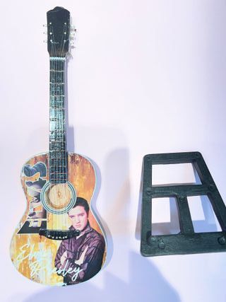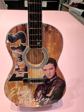 Réplica en miniatura de una guitarra decorativa con diseño de Elvis Presley. ( 2 pequeñas rozaduras ,mirar la foto) - Decorada con imágenes de Elvis Presley. - Incluye el nombre Elvis Presley en la parte frontal. - Acabado rústico y detallado.