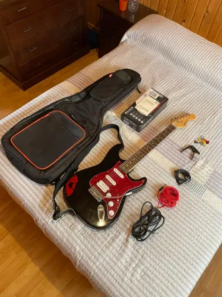 Pack completo para empezar a tocar la guitarra eléctrica. Incluye todo lo necesario. - Guitarra eléctrica negra con detalles rojos. - Funda de guitarra acolchada. - Amplificador - Cables de conexión. - Púas de guitarra. - Cejilla. -Soporte de pared. -Pedal de sonidos. -Correa guitarra. Todo está en perfectas condiciones, sin ningún desperfecto. Se pueden comprar por separado, preguntar precio. Precio negociable.