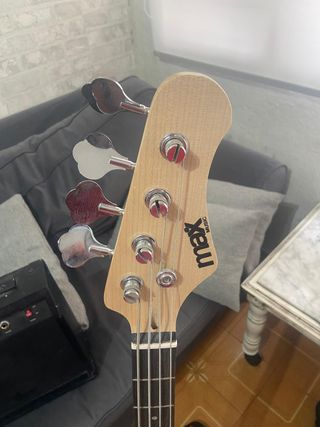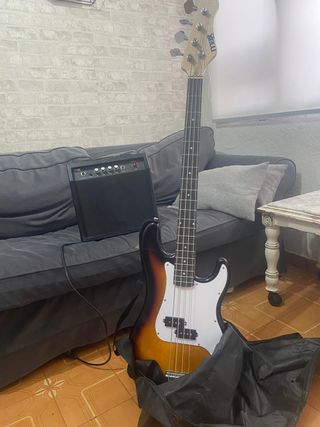 Se vende kit de bajo eléctrico de 4 cuerdas junto con un amplificador. - Bajo eléctrico con acabado sunburst. - Amplificador compacto para practicar. - Funda protectora - Cuerdas de recambio - Soporte para el suelo