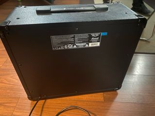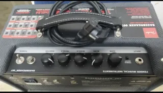 amplificador (transistor) usado para ensayos y 3 conciertos conectado a pantallas (nunca ha estado a volumen mayor del 4). Con pedal original de cambio de canal a limpio, distorsión suave y distorsión fuerte. De los mejores productos que ha sacado Fender, muy fiel, muy buena calidad de sonido. Es único en calidad de distorsión 2 canales. mejor que el clásico Marshall!