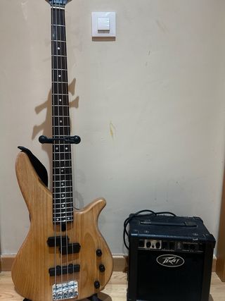 Se vende bajo eléctrico Yamaha junto con un amplificador Peavey. - Bajo eléctrico Yamaha de madera natural. - Amplificador de bajo Peavey.