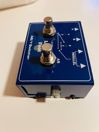 Pedal selector AB/Y para guitarra marca Lead Foot. Permite alternar entre dos amplificadores o enviar la señal a ambos. - Carcasa metálica azul. - Dos footswitches. - Indicadores LED.