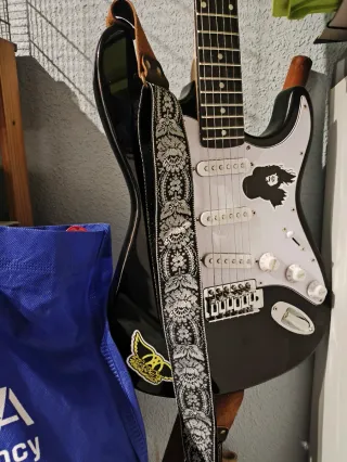 Guitarra eléctrica Squier Affinity Stratocaster en color negro. - Cuerpo de álamo. - Mástil de arce. - Diapasón de laurel. - Tres pastillas de bobina simple. - Puente de trémolo sincronizado. Se vende con el tremolo. es perfecta para principiantes y con nivel avanzado. Guitarra gama media. Precio algo negociable. Se vende con soporte para colgar en la pared, y púas de regalo. Opción de compra con amplificador y mochila para la guitarra por 220€